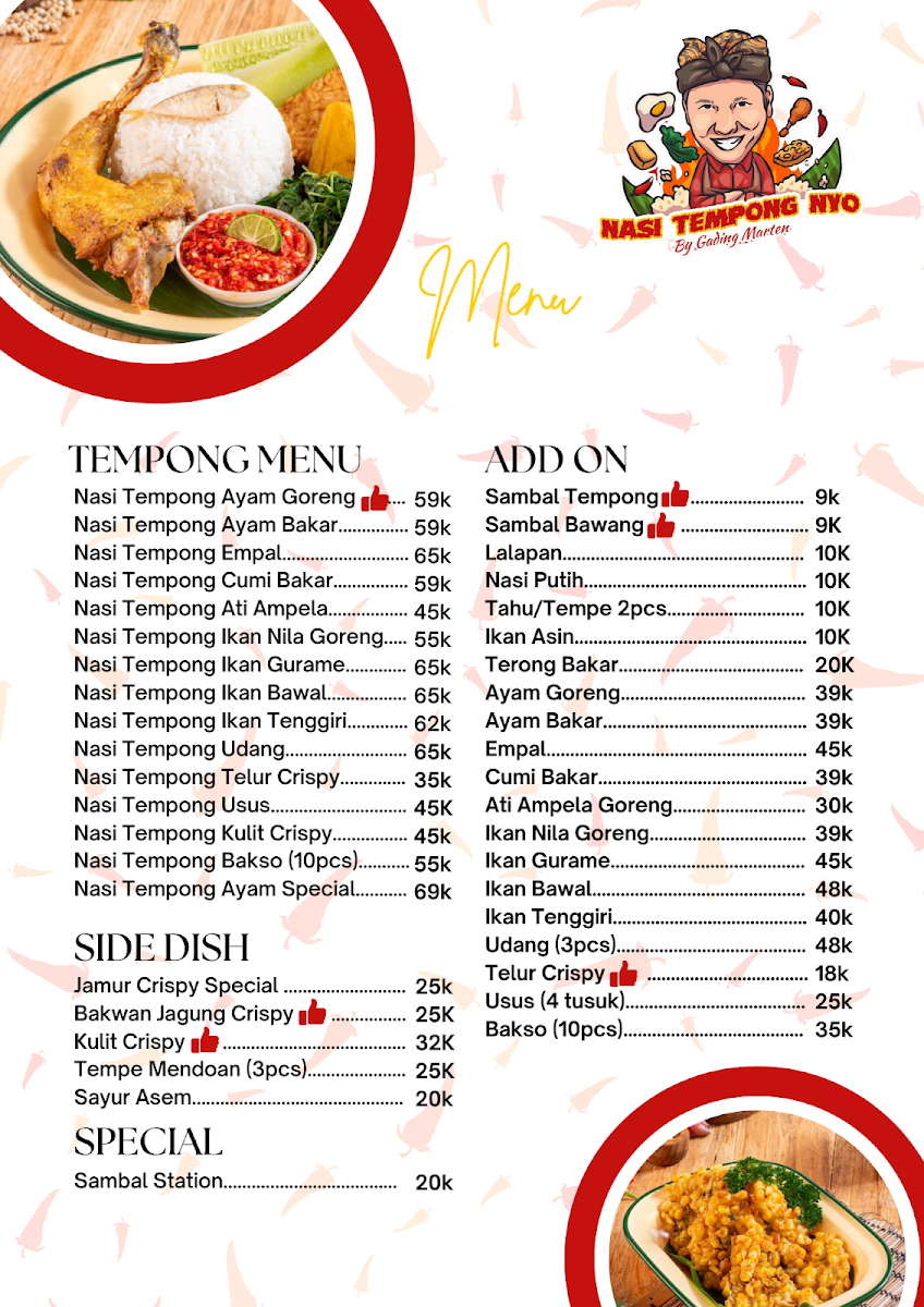 Welcome to Nasi Tempong Nyo by Gading Marten, a contemporary culinary gem located in the heart of Jakarta at Ruko Soho Ebony Island. This vibrant eatery specializes in 'nasi tempong,' featuring crispy tilapia served with an irresistible spicy chili sauce that has won the hearts of many diners.